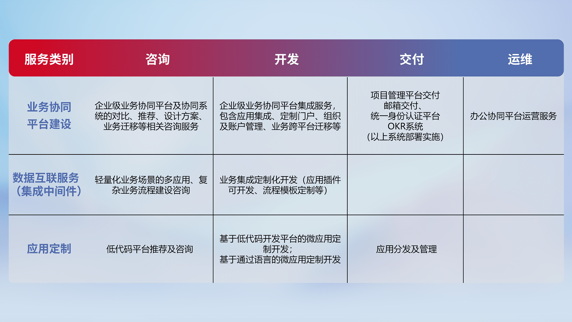 针对钉钉、、、、企微、、、、IDaas等平台级产品提供产品的规划、、、方案、、、交付、、定制化开发等服务,,,实现如统一协同办公、、、智能客户服务、、混合会议管理、、智能数据查询、、等业务场景,,,,实现数字化转型。。。。
