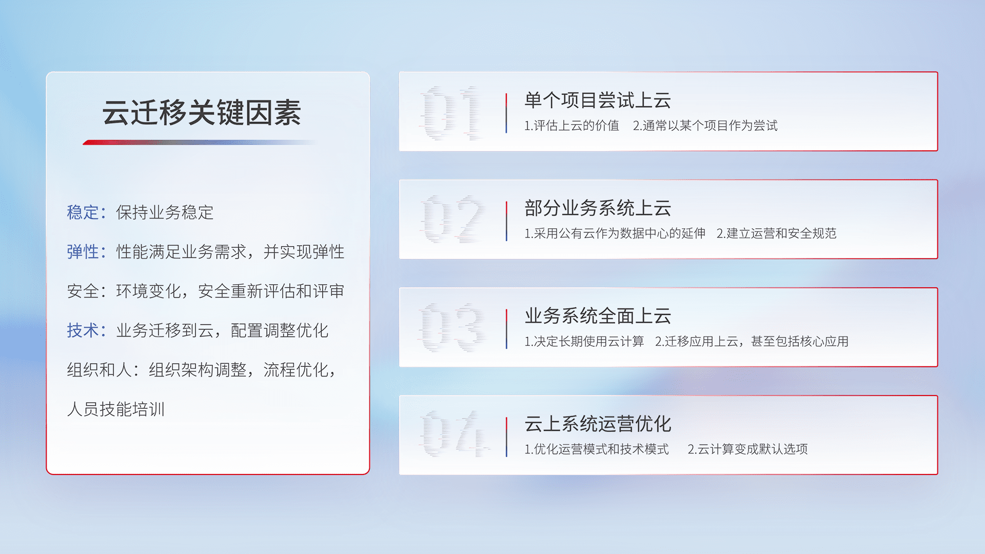 结合实际业务,,,从规划设计、、、云平台选型、、、、云原生改造、、、数据迁移、、、集成交付,,,,迁移全过程为客户识别最佳上云路径,,,做好风险识别管理,,,设计网络架构、、、身份权限、、、安全审计合规、、、、操作审计、、、日志审计、、、监控告警策略、、、多站点容灾设计等,,,对云上基础设施进行整体规划,,提升IT治理水平,,,,以满足弹性、、高可用、、、、高性能的需求。。。