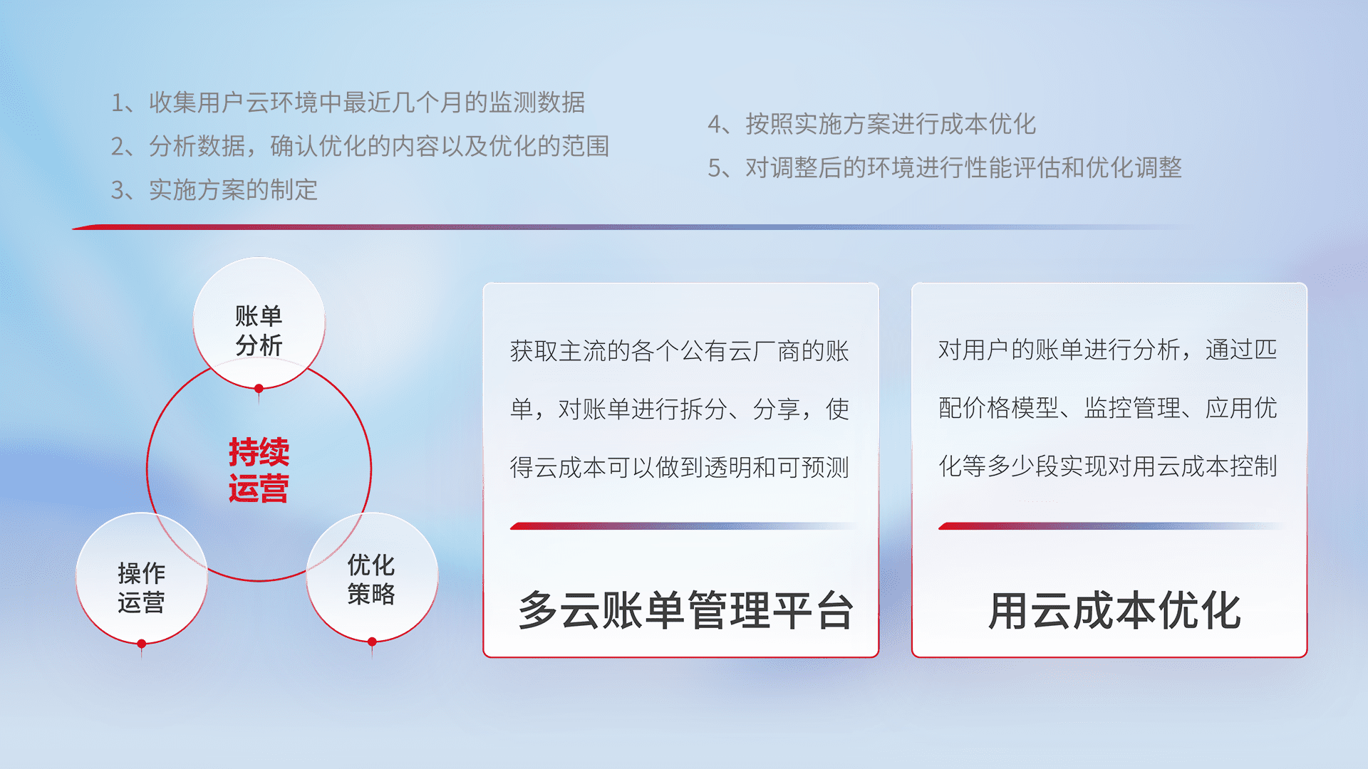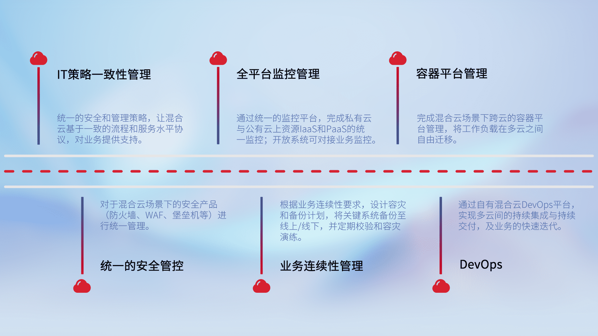 通过多云纳管,,,以统一的资源数据模型把客户的云资源进行抽象和封装,,,,进而实现对多云资源的统一操作,,保障云资源管理的可靠性、、、、稳定性与可用性。。。量身定制化运维内容,,,配置、、、开发运维、、、补丁管理、、、、备份、、、、监控、、认证和访问管理、、、、审计和日常巡检等,,,,保障在用云过程中的可靠度,,,稳定度以及高可用率。。
